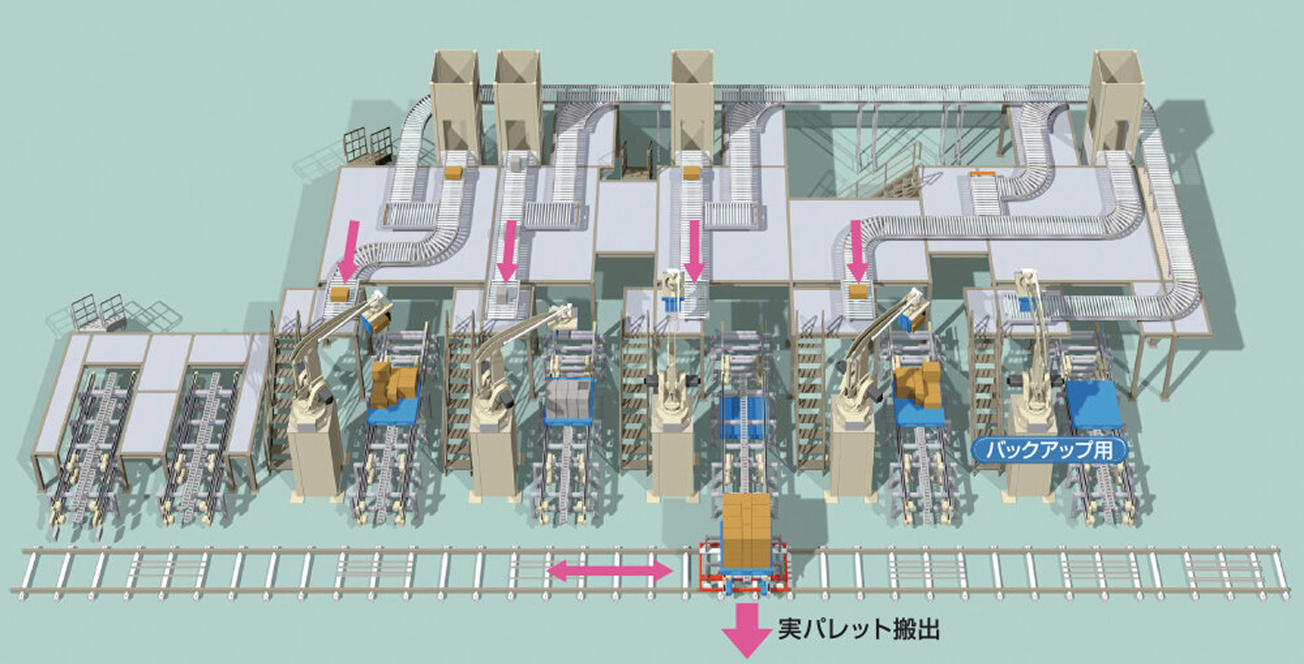 これまで4ラインから流れてくる製品を3台のロボパレで処理するため、上流部にソータを組み込み、3台のロボパレへ振り分けていました。しかし、品種によっては生産量がロボパレの能力を上回る場合があります。その場合にはソータが振り分けた後、ロボパレへの供給コンベヤ上に製品が満杯になってしまいライン停止が発生していました。そこで、ソータでの振り分けを取りやめ、1ライン1台の計4台を採用するとともに、万一のトラブルへのバックアップ用としてもう1台の合計5台を導入しました。